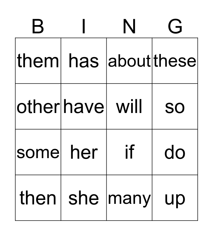 This bingo card has 16 words: she, do, about, them, some, has, if, many, other, have, then, these, her, so, will and up.