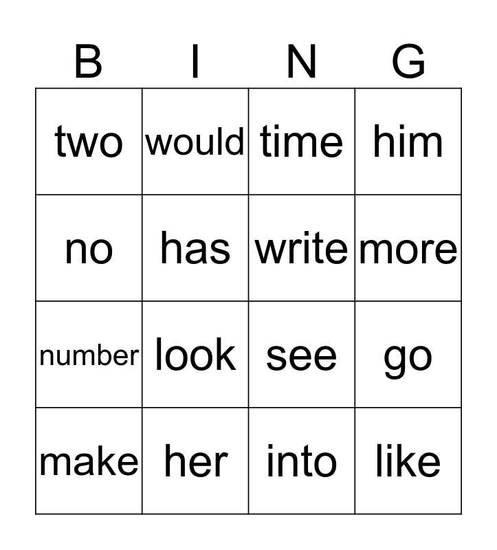 This bingo card has 16 words: her, go, time, two, number, would, see, into, no, has, make, him, look, more, write and like.