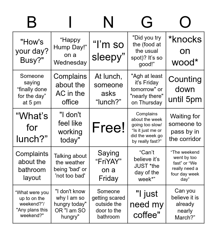 This bingo card has a free space and 24 words: Talking about the weather being 'bad' or 'not too bad', "I don't know why I am so hungry today" OR "I am SO hungry", At lunch, someone asks “lunch?”, “What were you up to on the weekend?”/ "Any plans this weekend?", *knocks on wood*, "How's your day? Busy?", Someone saying “finally done for the day” at 5 pm, “Happy Hump Day!” on a Wednesday, Complains about the week going too slow/ “Is it just me or did the week go by really fast?”, Saying “FriYAY” on a Friday, "Agh at least it's Friday tomorrow" or "nearly there" on Thursday, “What’s for lunch?”, “Can’t believe it’s JUST *the day of the week*”, “The weekend went by too fast” or “We really need a four day week day”, Complains about the AC in the office, "I just need my coffee", Waiting for someone to pass by in the corridor, “I’m so sleepy”, Counting down until 5pm, "I don't feel like working today", Can you believe it is already nearly March?”, Complaints about the bathroom layout, "Did you try the (food at the usual spot)? It’s so good!” and Someone getting scared outside the door to the bathroom.
