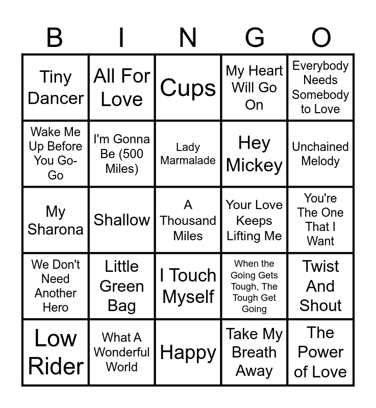 This bingo card has 74 words: Don't You (Forget About Me), Stayin' Alive, Cups, Stand by Me, (I've Had) The Time of My Life, (Everything I Do) I Do It for You, Footloose, Wind Beneath My Wings, Low Rider, Maniac, 9 to 5, Old Time Rock & Roll, Lady Marmalade, Wake Me Up Before You Go-Go, Holiday Road, Shallow, The Power of Love, Unchained Melody, Magic Dance, My Sharona, I'm Gonna Be (500 Miles), All For Love, My Heart Will Go On, I Don't Want to Miss A Thing, A Thousand Miles, Wild Wild West, You're The One That I Want, Blinded By the Light, Danger Zone, Fame, Everybody Needs Somebody to Love, Johnny B Goode, La Bamba, Kokomo, St. Elmos Fire, Take My Breath Away, Skyfall, Gangsta's Paradise, Blaze Of Glory, Neutron Dance, Happy, What A Wonderful World, Let's Hear It for the Boy, Can You Feel the Love Tonight, Mustang Sally, Tiny Dancer, I'm Alright, Little Green Bag, The Heat Is On, Pure Shores, Stuck In the Middle with You, Love Me Like You Do, You're The One That I Want, Eye of the Tiger, The Devil Went Down to Georgia, Accidentally In Love, I Touch Myself, Ghostbusters, See You Again, Twist And Shout, Hey Mickey, Light My Fire, We Don't Need Another Hero, My Girl, Your Love Keeps Lifting Me, A Thousand Years, Werewolves of London, Lose Yourself, When the Going Gets Tough, The Tough Get Going, Banana Boat (Day-O), When Doves Cry, It Must Have Been Love, We Are the Champions and Sweet Home Alabama.
