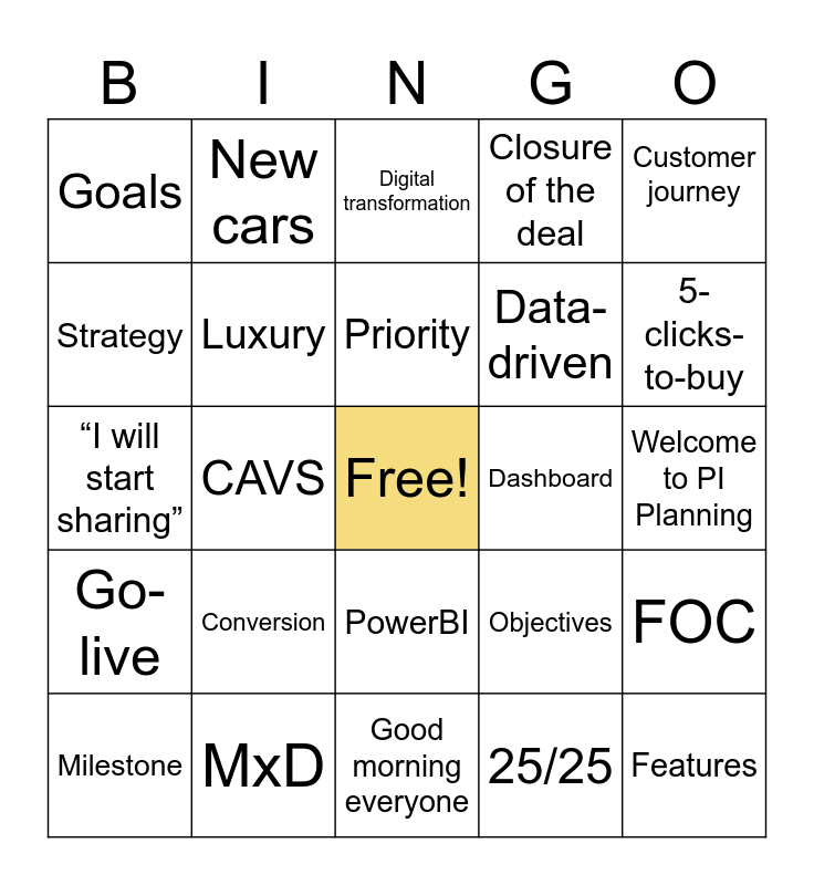 This bingo card has a free space and 24 words: Conversion, MxD, Priority, Milestone, Customer journey, Goals, Strategy, New cars, Dashboard, PowerBI, Data-driven, “I will start sharing”, Objectives, FOC, Luxury, 25/25, Welcome to PI Planning, Digital transformation, 5-clicks-to-buy, CAVS, Features, Go-live, Closure of the deal and Good morning everyone.
