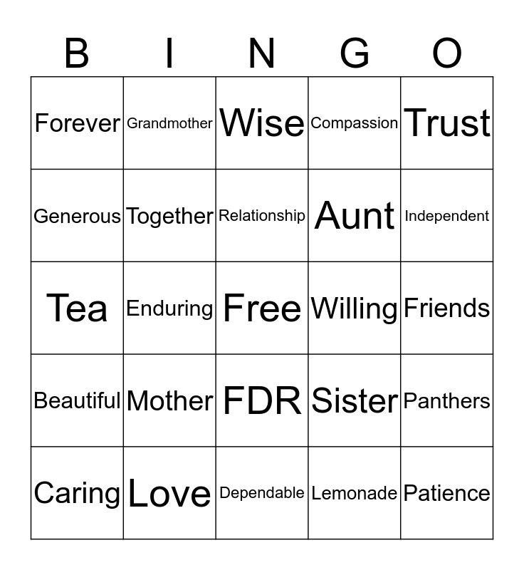 This bingo card has a free space and 24 words: Mother, Love, Relationship, Caring, Trust, Forever, Generous, Grandmother, Willing, FDR, Aunt, Tea, Sister, Panthers, Together, Lemonade, Friends, Wise, Independent, Enduring, Patience, Beautiful, Compassion and Dependable.