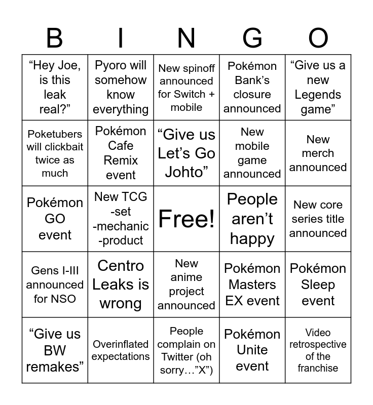 This bingo card has a free space and 24 words: Centro Leaks is wrong, Overinflated expectations, “Give us Let’s Go Johto”, “Give us BW remakes”, “Give us a new Legends game”, “Hey Joe, is this leak real?”, Poketubers will clickbait twice as much, Pyoro will somehow know everything, People aren’t happy, New anime project announced, New mobile game announced, Pokémon GO event, Pokémon Masters EX event, Pokémon Sleep event, Pokémon Cafe Remix event, Pokémon Unite event, New core series title announced, New spinoff announced for Switch + mobile, New merch announced, New TCG -set -mechanic -product, Video retrospective of the franchise, Gens I-III announced for NSO, Pokémon Bank’s closure announced and People complain on Twitter (oh sorry…”X”).