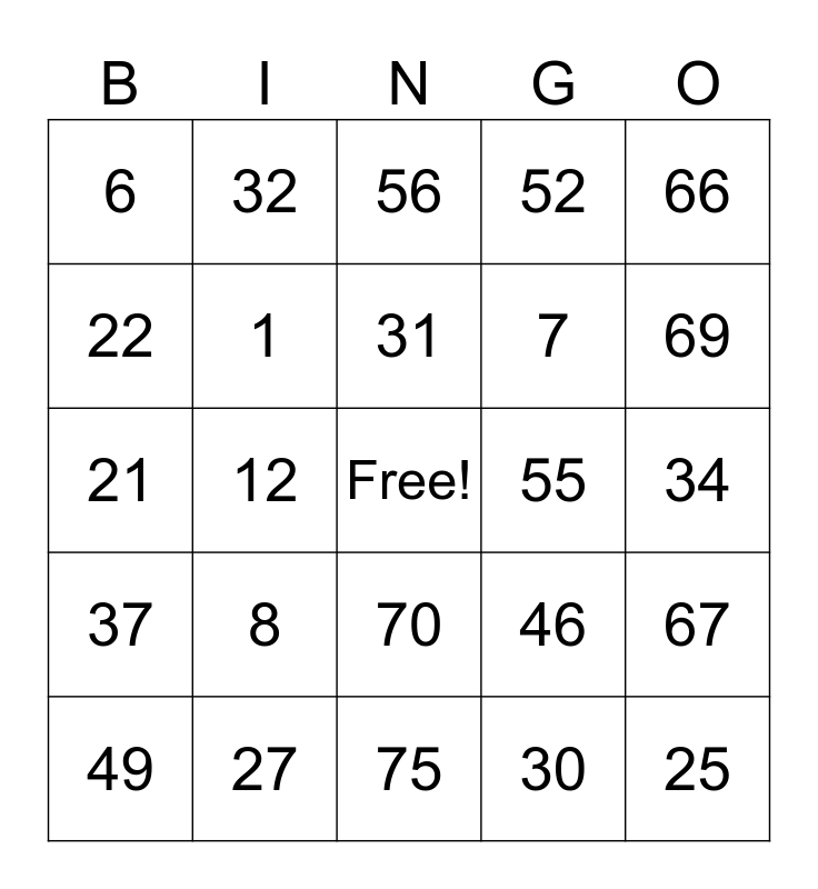 This bingo card has a free space and 24 words: 8, 27, 31, 49, 66, 6, 22, 32, 55, 70, 7, 21, 46, 67, 1, 30, 34, 56, 69, 12, 25, 37, 52 and 75.