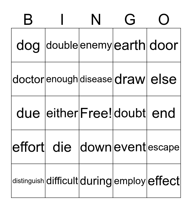 This bingo card has a free space and 24 words: die, difficult, disease, distinguish, door, dog, doctor, double, doubt, down, draw, due, event, escape, enough, employ, end, enemy, else, either, effect, effort, earth and during.