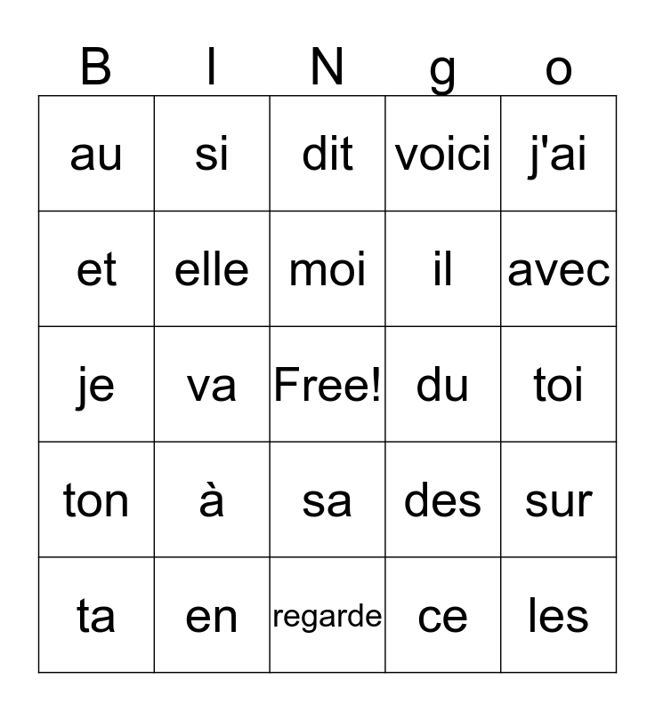 This bingo card has a free space and 24 words: à, en, moi, ta, j'ai, au, et, si, du, sa, il, je, des, sur, elle, ce, toi, dit, avec, va, les, ton, voici and regarde.