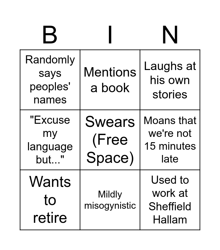 This bingo card has a free space and 11 words: Golf mentioned, Mildly misogynistic, Used to work at Sheffield Hallam, Wants to retire, Mentions a book, Laughs at his own stories, Moans that we're not 15 minutes late, Used to be a party animal, "Excuse my language but...", Randomly says peoples' names and Pointless anecdote.