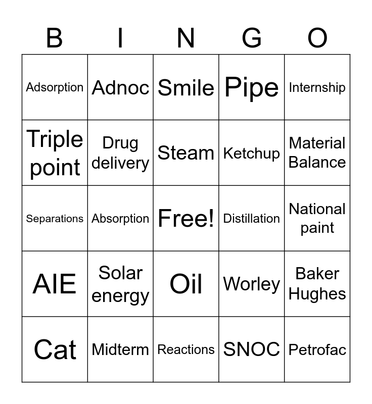 This bingo card has a free space and 44 words: Thermo, Petrofac, Apple, Cat, Dr. Sameer, SNOC, Smile, Alumini, Internship, Midterm, Pipe, Distillation, Oil, Solar energy, ESB, Reactions, Henkel, Separations, Waste Management, Material Balance, Adnoc, Mass transfer, Crystallization, Adsorption, DEWA, National paint, Plants, Total energies, Worley, AIE, Heat transfer, Baker Hughes, Fluid Mechanics, Sustainability, Absorption, Material science, MATLAB, HYSYS, Steam, Triple point, Ketchup, Cosmetics, Drug delivery and Green.