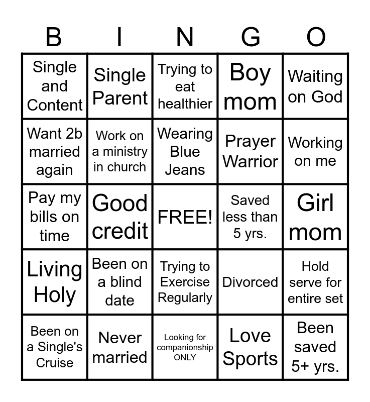 This bingo card has a free space and 24 words: Been on a blind date, Never married, Wearing Blue Jeans, Been on a Single's Cruise, Waiting on God, Single and Content, Want 2b married again, Single Parent, Saved less than 5 yrs., Trying to Exercise Regularly, Prayer Warrior, Pay my bills on time, Divorced, Hold serve for entire set, Work on a ministry in church, Love Sports, Girl mom, Trying to eat healthier, Working on me, Good credit, Been saved 5+ yrs., Living Holy, Boy mom and Looking for companionship ONLY.