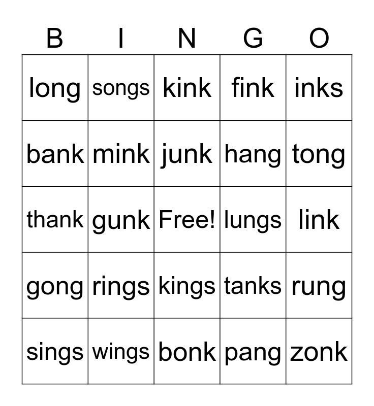 This bingo card has a free space and 24 words: rings, wings, junk, sings, inks, long, bank, songs, lungs, kings, hang, thank, tanks, rung, mink, pang, link, kink, tong, gunk, zonk, gong, fink and bonk.