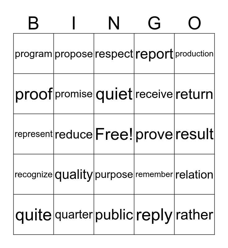 This bingo card has a free space and 24 words: quality, quarter, quiet, quite, production, program, proof, propose, prove, purpose, receive, represent, remember, relation, promise, reply, result, respect, return, reduce, rather, recognize, report and public.