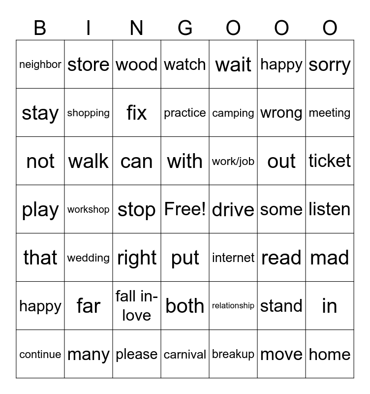 This bingo card has a free space and 48 words: relationship, wrong, carnival, workshop, can, listen, store, many, happy, put, sorry, watch, out, work/job, happy, some, stay, meeting, stand, wait, camping, stop, neighbor, shopping, in, fix, ticket, continue, with, walk, move, drive, mad, far, play, internet, read, not, right, fall in-love, that, home, wood, please, practice, both, wedding and breakup.