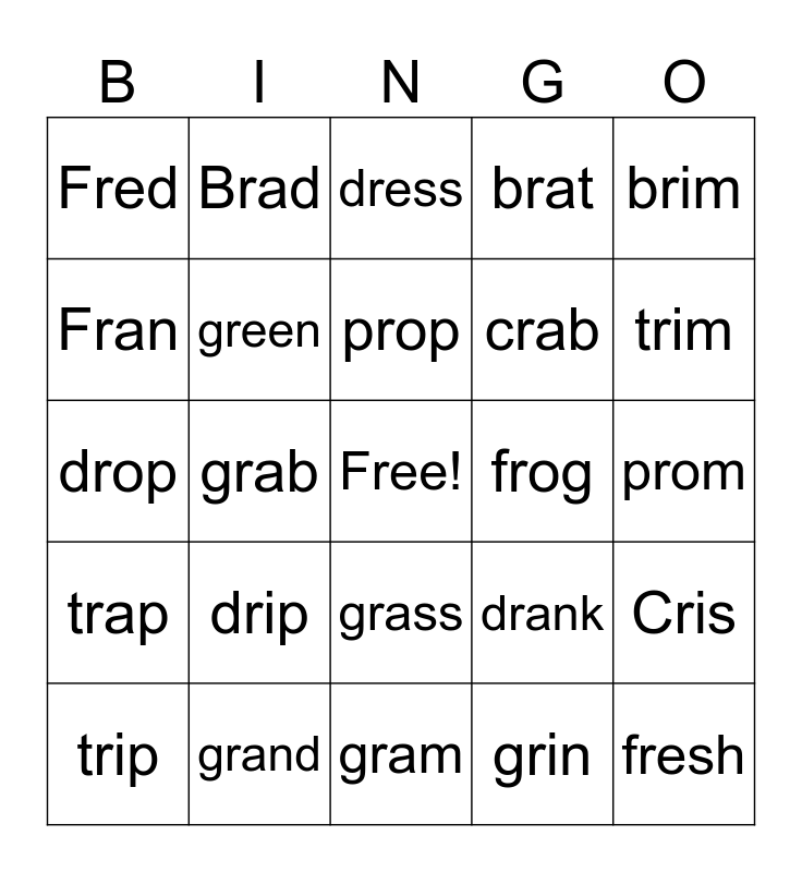 This bingo card has a free space and 25 words: drip, gram, prop, trip, brim, Fred, Fran, Brad, frog, grass, crab, drop, drank, Cris, green, crops, prom, dress, trim, grab, fresh, grand, trap, brat and grin.