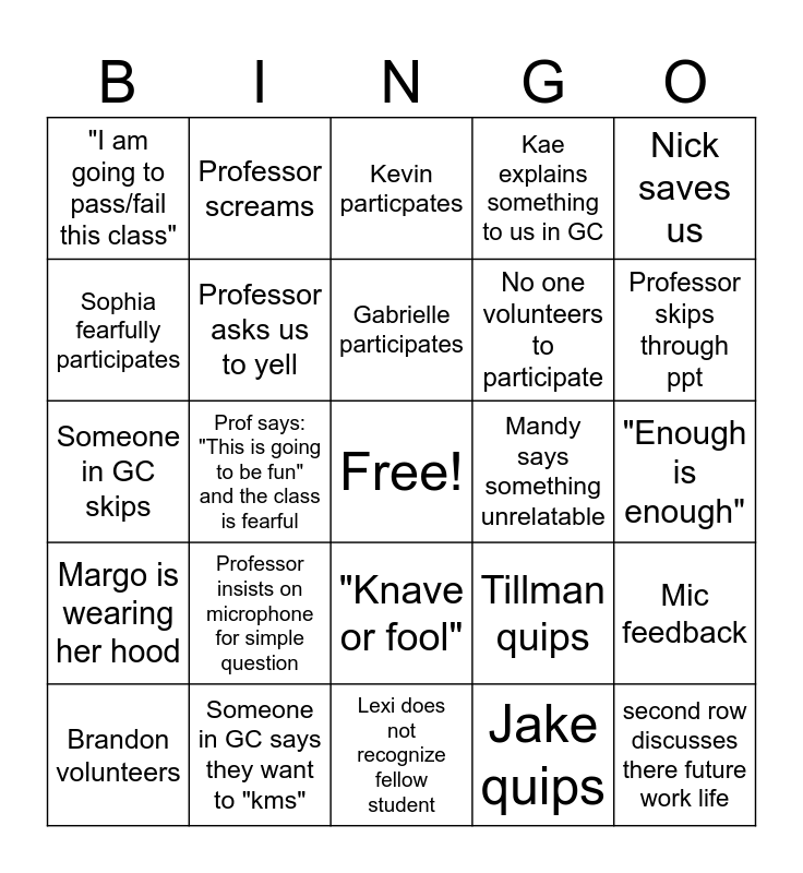 This bingo card has a free space and 24 words: Professor insists on microphone for simple question, Someone in GC says they want to "kms", Gabrielle participates, Brandon volunteers, Nick saves us, "I am going to pass/fail this class", Sophia fearfully participates, Professor screams, Mandy says something unrelatable, "Knave or fool", No one volunteers to participate, Someone in GC skips, Tillman quips, Mic feedback, Professor asks us to yell, Jake quips, "Enough is enough", Kevin particpates, Professor skips through ppt, Prof says: "This is going to be fun" and the class is fearful, second row discusses there future work life, Margo is wearing her hood, Kae explains something to us in GC and Lexi does not recognize fellow student.