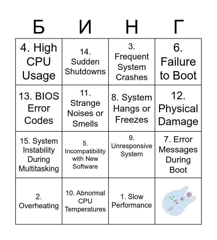 This bingo card has 1 images and 16 words: 1. Slow Performance, 2. Overheating, 3. Frequent System Crashes, 4. High CPU Usage, 5. Incompatibility with New Software, 6. Failure to Boot, 7. Error Messages During Boot, 8. System Hangs or Freezes, 12. Physical Damage, 11. Strange Noises or Smells, 10. Abnormal CPU Temperatures, 9. Unresponsive System, 13. BIOS Error Codes, 14. Sudden Shutdowns, 15. System Instability During Multitasking and 16. Compatibility Issues with New Hardware.