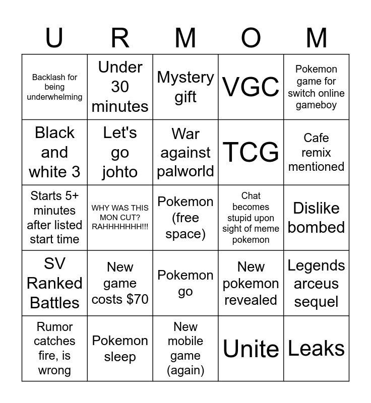 This bingo card has a free space and 24 words: New game costs $70, Pokemon sleep, War against palworld, Rumor catches fire, is wrong, Pokemon game for switch online gameboy, Backlash for being underwhelming, Black and white 3, Under 30 minutes, Chat becomes stupid upon sight of meme pokemon, Pokemon go, TCG, Starts 5+ minutes after listed start time, New pokemon revealed, Legends arceus sequel, Let's go johto, Unite, Dislike bombed, Mystery gift, Cafe remix mentioned, WHY WAS THIS MON CUT? RAHHHHHHH!!!, Leaks, SV Ranked Battles, VGC and New mobile game (again).