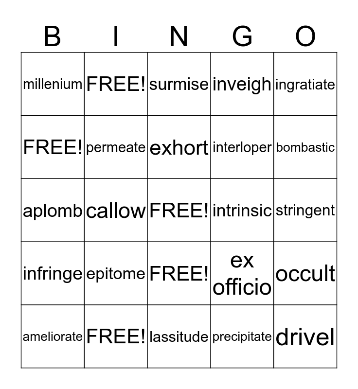 This bingo card has a free space and 24 words: epitome, FREE!, exhort, ameliorate, ingratiate, millenium, FREE!, FREE!, intrinsic, FREE!, interloper, aplomb, ex officio, occult, permeate, precipitate, stringent, surmise, bombastic, callow, drivel, infringe, inveigh and lassitude.