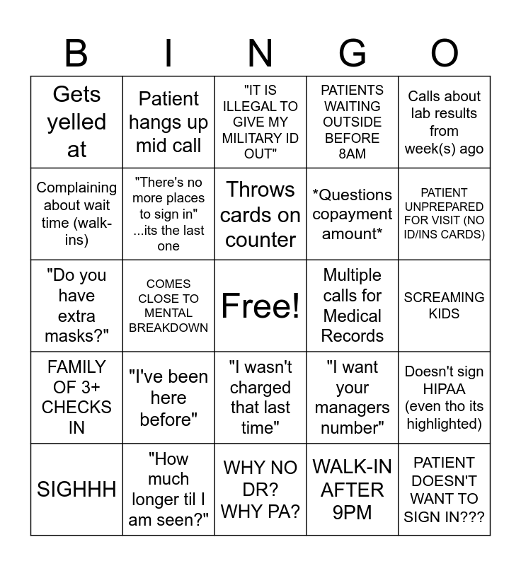 This bingo card has a free space and 24 words: "I've been here before", "How much longer til I am seen?", Throws cards on counter, SIGHHH, Calls about lab results from week(s) ago, Gets yelled at, Complaining about wait time (walk-ins), Patient hangs up mid call, Multiple calls for Medical Records, "I wasn't charged that last time", *Questions copayment amount*, "Do you have extra masks?", "I want your managers number", Doesn't sign HIPAA (even tho its highlighted), "There's no more places to sign in" ...its the last one, WALK-IN AFTER 9PM, SCREAMING KIDS, "IT IS ILLEGAL TO GIVE MY MILITARY ID OUT", PATIENT UNPREPARED FOR VISIT (NO ID/INS CARDS), COMES CLOSE TO MENTAL BREAKDOWN, PATIENT DOESN'T WANT TO SIGN IN???, FAMILY OF 3+ CHECKS IN, PATIENTS WAITING OUTSIDE BEFORE 8AM and WHY NO DR? WHY PA?.