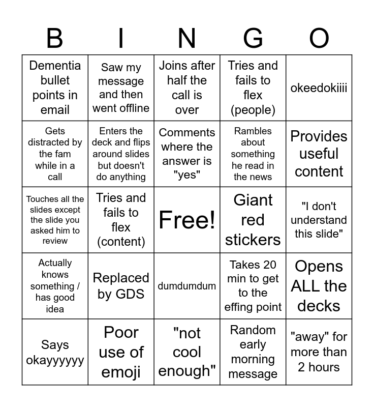 This bingo card has a free space and 27 words: Takes 20 min to get to the effing point, Says um, Rambles about something he read in the news, "not cool enough", Gets distracted by the fam while in a call, Joins after half the call is over, Saw my message and then went offline, Actually knows something / has good idea, Giant red stickers, Opens ALL the decks, Touches all the slides except the slide you asked him to review, Tries and fails to flex (people), Says okayyyyyy, Poor use of emoji, Provides useful content, Is camera off in the meeting, Enters the deck and flips around slides but doesn't do anything, Comments where the answer is "yes", Replaced by GDS, Dementia bullet points in email, "I don't understand this slide", Random early morning message, Tries and fails to flex (content), "away" for more than 2 hours, dumdumdum, okeedokiiii and "It would be super cool if you had a view on this, okay?".