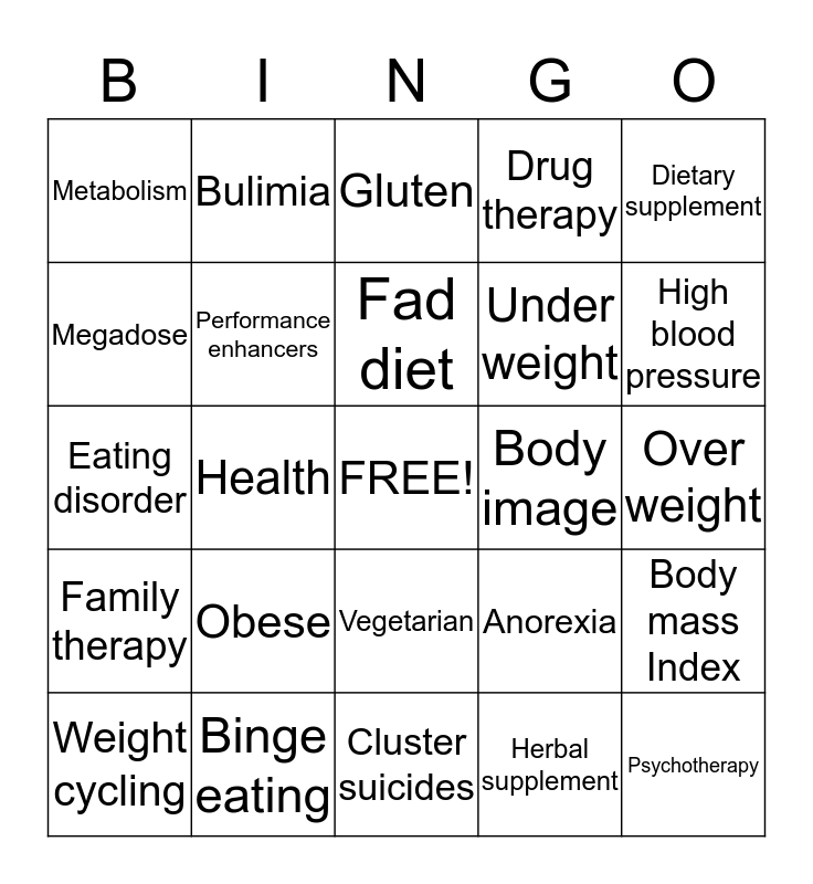 This bingo card has a free space and 24 words: Obese, Binge eating, Fad diet, Weight cycling, Dietary supplement, Metabolism, Megadose, Bulimia, Body image, Vegetarian, Under weight, Eating disorder, Anorexia, Body mass Index, Performance enhancers, Herbal supplement, Over weight, Gluten, High blood pressure, Health, Psychotherapy, Family therapy, Drug therapy and Cluster suicides.