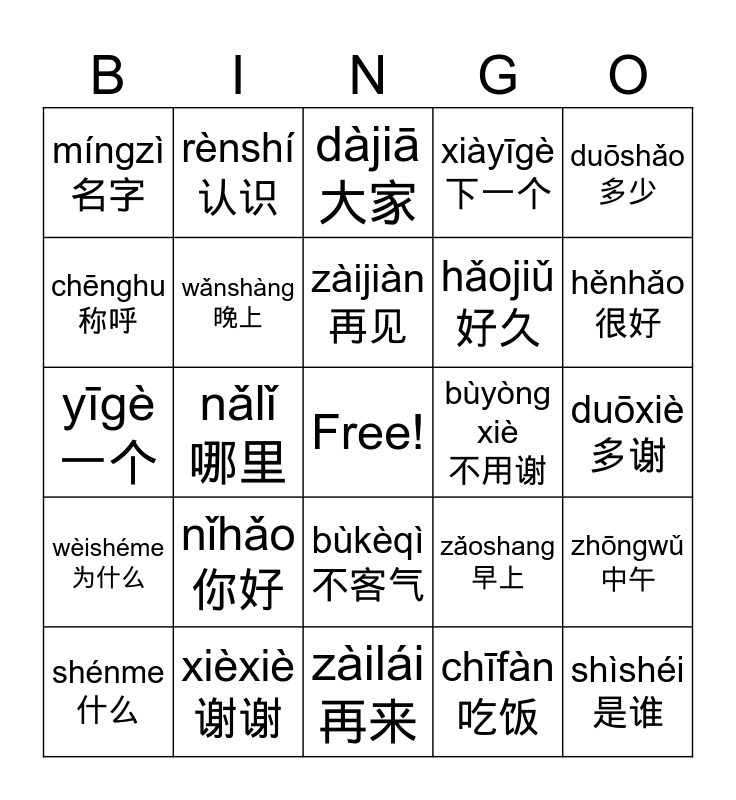 This bingo card has a free space and 24 words: nǐhǎo 你好, xièxiè 谢谢, zàijiàn 再见, shénme 什么, duōshǎo 多少, míngzì 名字, chēnghu 称呼, rènshí 认识, bùyòng xiè 不用谢, bùkèqì 不客气, hǎojiǔ 好久, yīgè一个, zǎoshang 早上, zhōngwǔ 中午, wǎnshàng 晚上, chīfàn 吃饭, duōxiè 多谢, dàjiā 大家, hěnhǎo 很好, nǎlǐ 哪里, shìshéi是谁, wèishéme 为什么, xiàyīgè 下一个 and zàilái 再来.