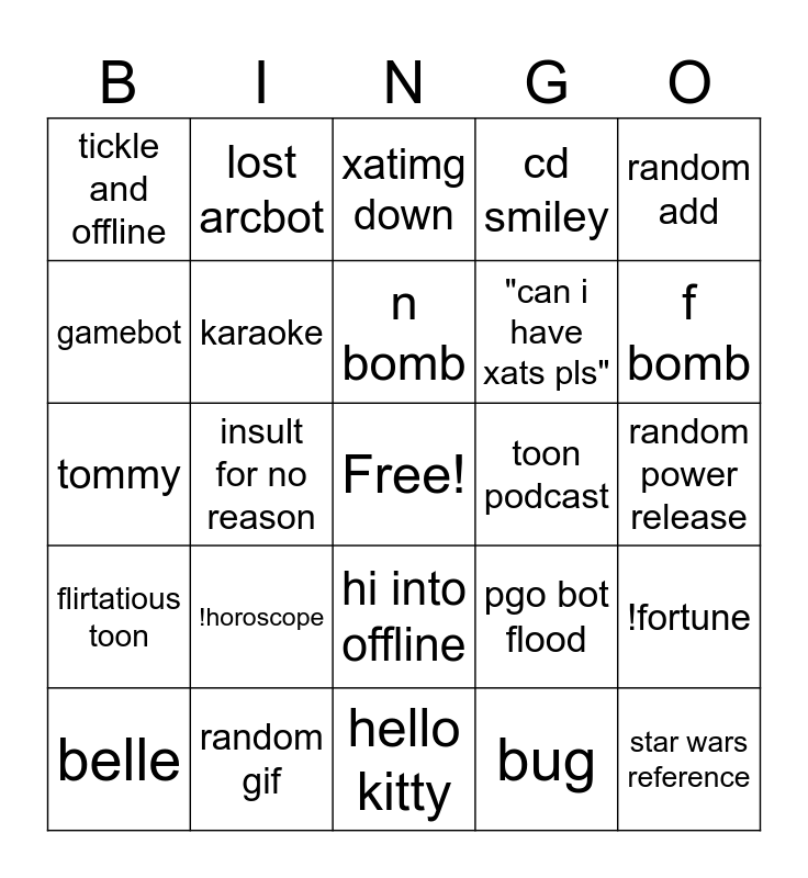 This bingo card has a free space and 24 words: !horoscope, random gif, n bomb, belle, random add, tickle and offline, gamebot, lost arcbot, toon podcast, hi into offline, "can i have xats pls", tommy, pgo bot flood, !fortune, karaoke, bug, random power release, xatimg down, f bomb, insult for no reason, star wars reference, flirtatious toon, cd smiley and hello kitty.