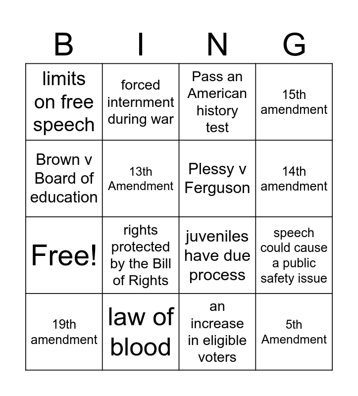 This bingo card has 20 words: 19th amendment, equal protection for all citizens, Pass an American history test, speech could cause a public safety issue, law of soil, rights protected by the Bill of Rights, an increase in eligible voters, 15th amendment, Free!, forced internment during war, juveniles have due process, 14th amendment, limits on free speech, law of blood, Plessy v Ferguson, Protection against self-incrimination, Brown v Board of education, 13th Amendment, Fair housing act and 5th Amendment.