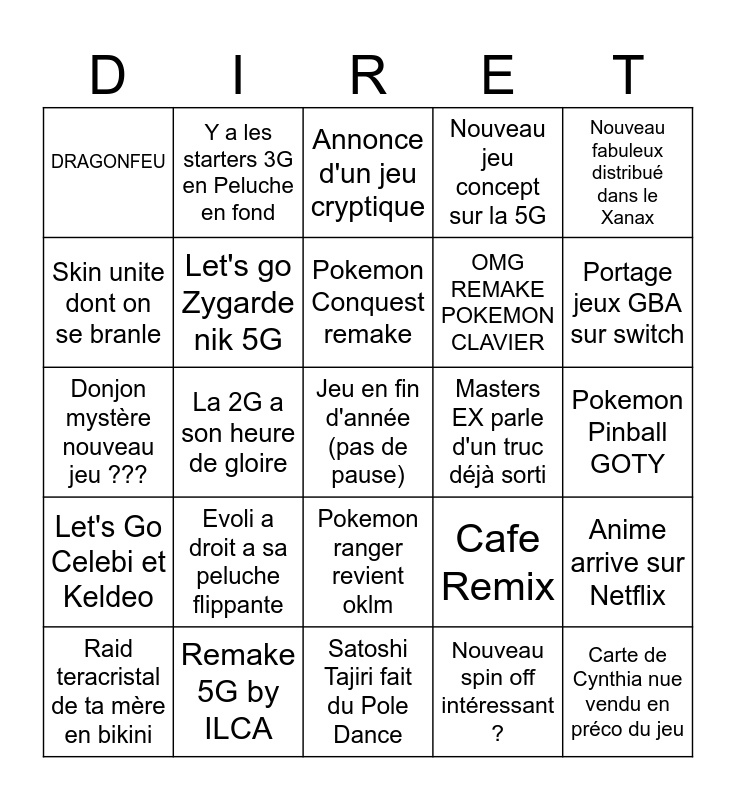 This bingo card has a free space and 24 words: Evoli a droit a sa peluche flippante, Remake 5G by ILCA, Pokemon Conquest remake, Raid teracristal de ta mère en bikini, Nouveau fabuleux distribué dans le Xanax, DRAGONFEU, Skin unite dont on se branle, Y a les starters 3G en Peluche en fond, Masters EX parle d'un truc déjà sorti, Pokemon ranger revient oklm, OMG REMAKE POKEMON CLAVIER, Donjon mystère nouveau jeu ???, Cafe Remix, Anime arrive sur Netflix, Let's go Zygarde nik 5G, Nouveau spin off intéressant ?, Pokemon Pinball GOTY, Annonce d'un jeu cryptique, Portage jeux GBA sur switch, La 2G a son heure de gloire, Carte de Cynthia nue vendu en préco du jeu, Let's Go Celebi et Keldeo, Nouveau jeu concept sur la 5G and Satoshi Tajiri fait du Pole Dance.
