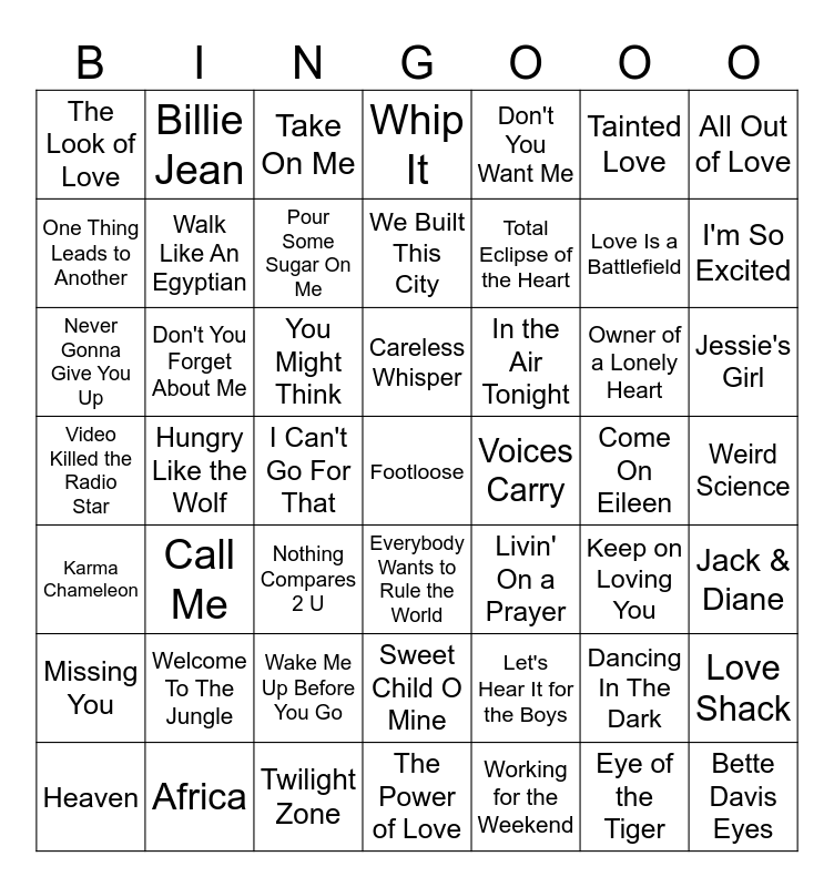 This bingo card has 101 words: Free!, Dancing In The Dark, Don't You Want Me, Caribbean Queen, Super Freak, Faith, Harden My Heart, Rock This Town, 99 Luftballoons, Our House, When Doves Cry, Everybody Have Fun Tonight, The Power of Love, Voices Carry, Girls Just Want to Have Fun, Jack & Diane, Don't You Forget About Me, Gloria, Little Red Corvette, Venus, Dancing with Myself, Down Under, Love Shack, Always Something There, Wake Me Up Before You Go, Pour Some Sugar On Me, Whip It, You Might Think, Manic Monday, Let's Go Crazy, Billie Jean, Take On Me, My Prerogative, Africa, Everybody Wants to Rule the World, Careless Whisper, Like a Virgin, Sweet Dreams, I Can't Go For That, Hungry Like the Wolf, Eye of the Tiger, Jessie's Girl, Sweet Child O Mine, Call Me, Nothing Compares 2 U, Love Is a Battlefield, Walking on Sunshine, Karma Chameleon, Sunglasses at Night, Footloose, Ghostbusters, Tainted Love, Come On Eileen, 1999, Major Tom, Electric Avenue, Centerfold, The NeverEnding Story, Jungle Love, Working for the Weekend, All Out of Love, 8675309, Shout, Raspberry Beret, Der Kommissar, Walk Like An Egyptian, I Still Haven't Found What, Total Eclipse of the Heart, Video Killed the Radio Star, Words, She Blinded Me with Science, Weird Science, The Look of Love, You Dropped a Bomb On Me, One Thing Leads to Another, We Built This City, Twilight Zone, Addicted to Love, Don't Worry, Be Happy, Heaven, Holding Back the Years, I Want to Know What Love Is, I'm So Excited, If You Leave, Livin' On a Prayer, Missing You, Never Gonna Give You Up, Just the Two of Us, Bette Davis Eyes, Father Figure, In the Air Tonight, Keep on Loving You, Purple Rain, I Want Candy, Let's Hear It for the Boys, Owner of a Lonely Heart, Walk This Way, Hold On Loosely, Welcome To The Jungle, What You Need and You Spin Me Round.