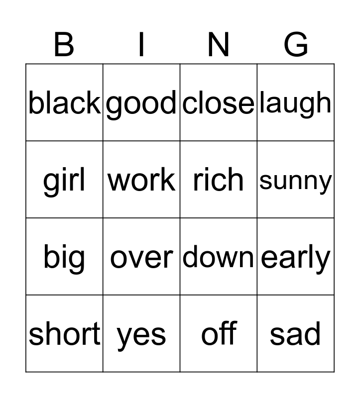 This bingo card has a free space and 15 words: short, sad, close, black, sunny, girl, over, off, work, big, early, laugh, rich, good and yes.