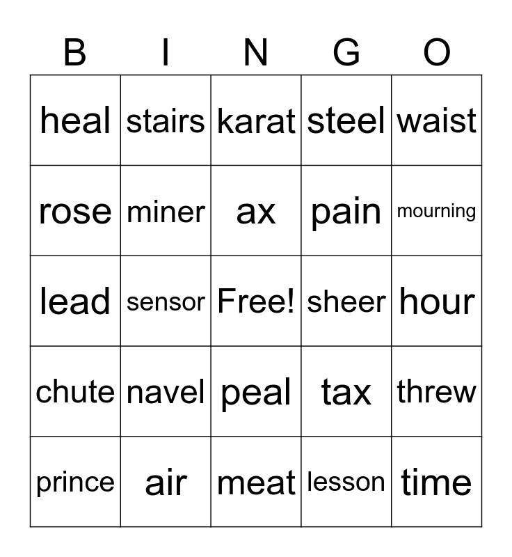 This bingo card has a free space and 29 words: prince, heard, sensor, bizarre, heal, karat, miner, navel, sheer, air, hour, time, meat, lesson, mourning, size, peal, chute, waist, lead, tax, past, pain, rose, steel, stairs, threw, ax and ate.