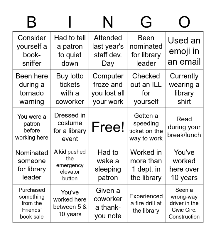 This bingo card has a free space and 39 words: Recommended our Library to a stranger outside of work, Own a TexShare card, Patron has recognized you outside of the library, Buy lotto tickets with a coworker, Purchased something from the Friends’ book sale, Had to wake a sleeping patron, Computer froze and you lost all your work, Have (or used to have) a favorite parking space, Used an emoji in an email, Nominated someone for library leader, Dressed in costume for a library event, Been nominated for library leader, Seen a wrong-way driver in the Civic Circ. Construction, Read during your break/lunch, Gotten a speeding ticket on the way to work, A kid pushed the emergency elevator button, Been robbed by the vending machine, Consider yourself a book-sniffer, Visited Christina’s desk, Worked in more than 1 dept. in the library, Been here during a tornado warning, Given a coworker a thank-you note, Checked out an ILL for yourself, Currently wearing a library shirt, Knocked a cart over, Made stuff in the hive while NOT on the clock, Ordered door dash to the library, Know the last names of everyone at your table, Called a coworker by the wrong name, Had to tell a patron to quiet down, Have 4 or more items checked out to you right now, Parked in the wrong place, Attended last year's staff dev. Day, You've worked here between 5 & 10 years, Experienced a fire drill at the library, You've worked here less than a year, You've worked here over 10 years, You were a patron before working here and You’ve worked here Between 1 & 5 years.
