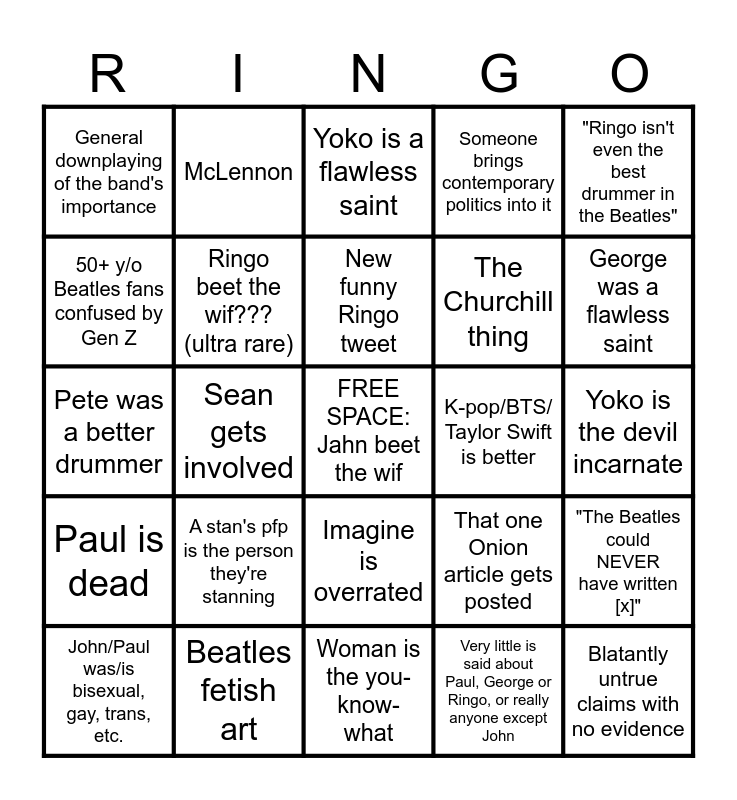 This bingo card has a free space and 24 words: A stan's pfp is the person they're stanning, Beatles fetish art, New funny Ringo tweet, John/Paul was/is bisexual, gay, trans, etc., "Ringo isn't even the best drummer in the Beatles", General downplaying of the band's importance, 50+ y/o Beatles fans confused by Gen Z, McLennon, K-pop/BTS/ Taylor Swift is better, Imagine is overrated, The Churchill thing, Pete was a better drummer, That one Onion article gets posted, "The Beatles could NEVER have written [x]", Ringo beet the wif??? (ultra rare), Very little is said about Paul, George or Ringo, or really anyone except John, Yoko is the devil incarnate, Yoko is a flawless saint, George was a flawless saint, Sean gets involved, Blatantly untrue claims with no evidence, Paul is dead, Someone brings contemporary politics into it and Woman is the you-know-what.