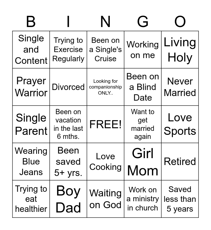 This bingo card has a free space and 24 words: Been saved 5+ yrs., Boy Dad, Looking for companionship ONLY.., Trying to eat healthier, Living Holy, Single and Content, Prayer Warrior, Trying to Exercise Regularly, Want to get married again, Love Cooking, Been on a Blind Date, Single Parent, Girl Mom, Retired, Divorced, Work on a ministry in church, Love Sports, Been on a Single's Cruise, Never Married, Been on vacation in the last 6 mths., Saved less than 5 years, Wearing Blue Jeans, Working on me and Waiting on God.