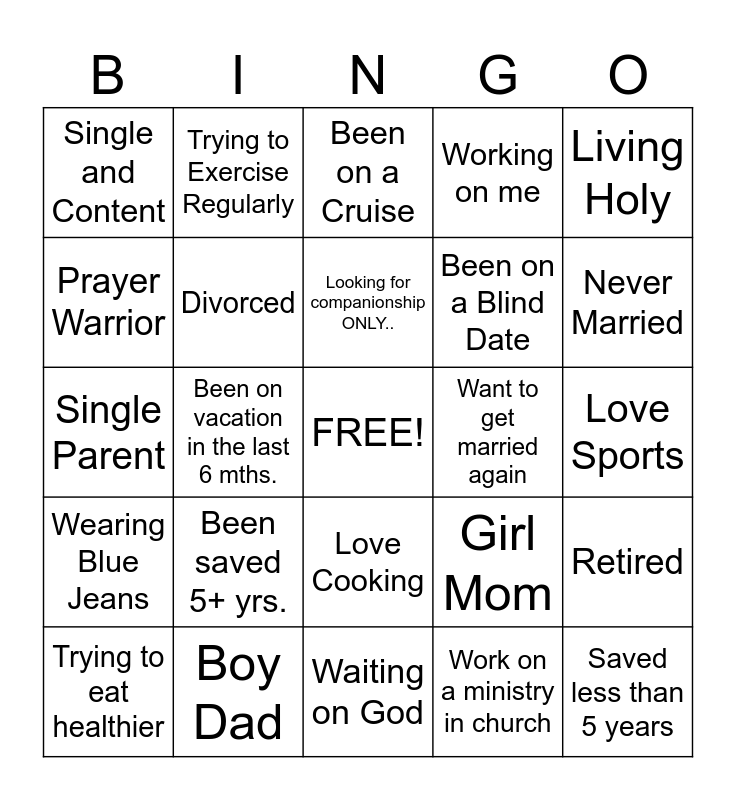 This bingo card has a free space and 24 words: Been saved 5+ yrs., Boy Dad, Looking for companionship ONLY.., Trying to eat healthier, Living Holy, Single and Content, Prayer Warrior, Trying to Exercise Regularly, Want to get married again, Love Cooking, Been on a Blind Date, Single Parent, Girl Mom, Retired, Divorced, Work on a ministry in church, Love Sports, Been on a Cruise, Never Married, Been on vacation in the last 6 mths., Saved less than 5 years, Wearing Blue Jeans, Working on me and Waiting on God.