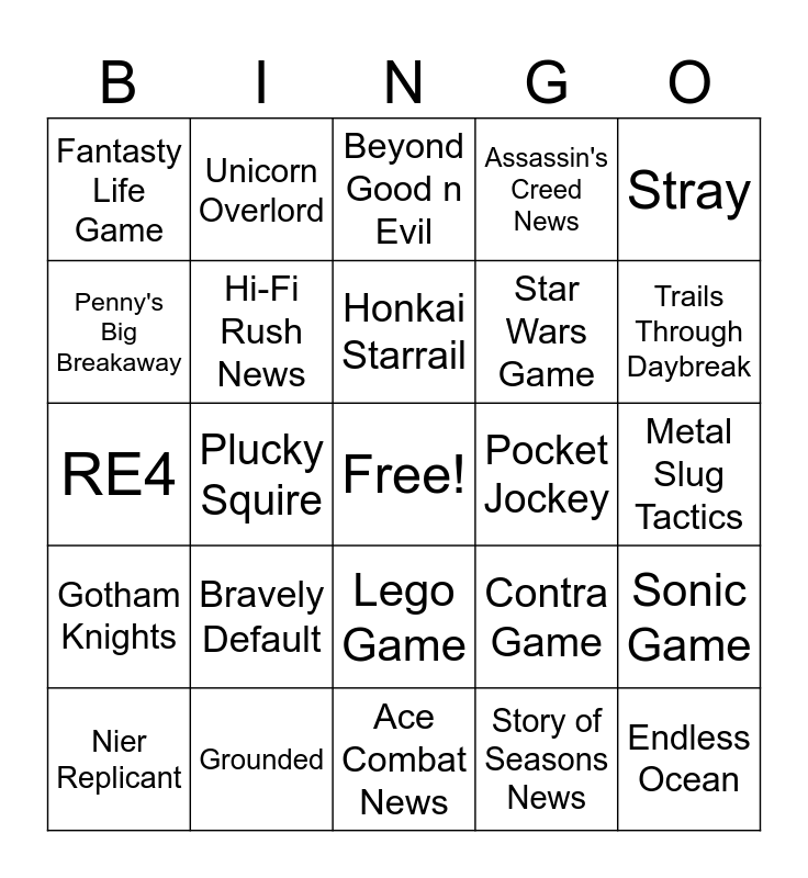 This bingo card has a free space and 31 words: Ace Combat News, Deca Police, Plucky Squire, Dragon Quest News, Fantasty Life Game, Beyond Good n Evil, Hi-Fi Rush News, Contra Game, Pocket Jockey, Story of Seasons News, Metal Slug Tactics, Endless Ocean, Final Fantasy Tactics, Little Nightmares, Trails Through Daybreak, South Park, Sonic Game, Bravely Default, Gotham Knights, Lego Game, Stray, Sea of Thieves, Nier Replicant, Unicorn Overlord, Star Wars Game, Penny's Big Breakaway, Assassin's Creed News, RE4, Grounded, Honkai Starrail and Super Monkey Ball.