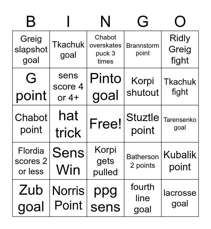 This bingo card has a free space and 24 words: Sens Win, Norris Point, Pinto goal, Zub goal, Ridly Greig fight, Greig slapshot goal, G point, Tkachuk goal, Stuztle point, Korpi gets pulled, Korpi shutout, Chabot point, Batherson 2 points, Kubalik point, sens score 4 or 4+, fourth line goal, Tarensenko goal, Chabot overskates puck 3 times, Tkachuk fight, hat trick, lacrosse goal, Flordia scores 2 or less, Brannstorm point and ppg sens.