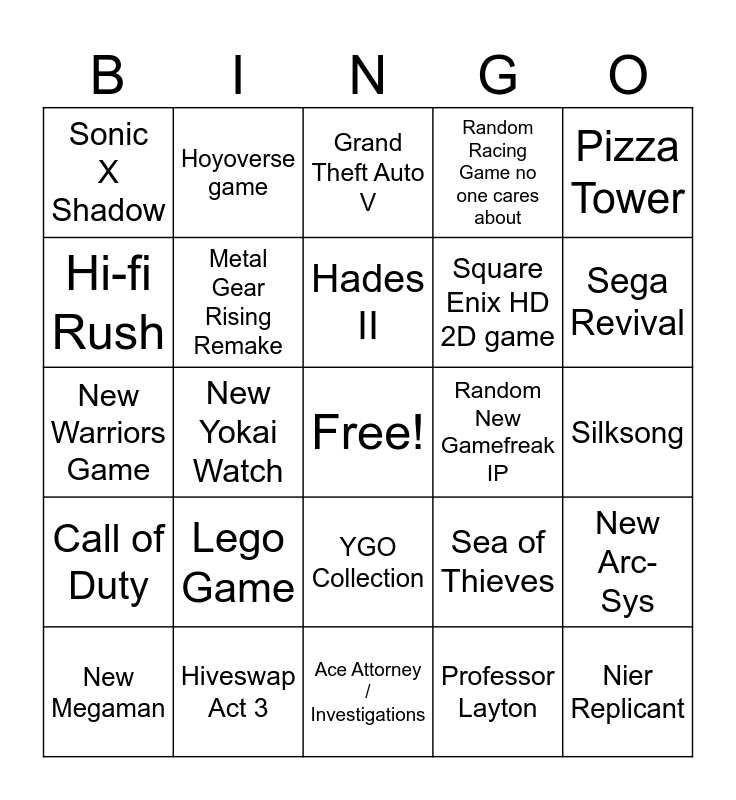 This bingo card has a free space and 24 words: Lego Game, Hiveswap Act 3, Hades II, New Megaman, Pizza Tower, Sonic X Shadow, Hi-fi Rush, Hoyoverse game, Random New Gamefreak IP, YGO Collection, Square Enix HD 2D game, New Warriors Game, Sea of Thieves, New Arc-Sys, Metal Gear Rising Remake, Professor Layton, Silksong, Grand Theft Auto V, Sega Revival, New Yokai Watch, Nier Replicant, Call of Duty, Random Racing Game no one cares about and Ace Attorney / Investigations.