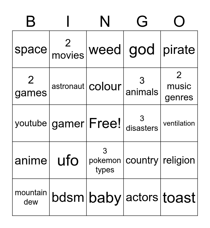This bingo card has a free space and 24 words: ufo, bdsm, colour, mountain dew, pirate, space, 2 games, 2 movies, 3 disasters, 3 pokemon types, 3 animals, youtube, country, religion, astronaut, actors, ventilation, weed, 2 music genres, gamer, toast, anime, god and baby.