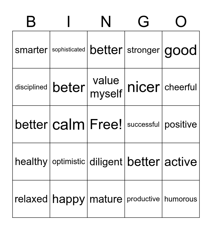 This bingo card has a free space and 24 words: optimistic, happy, value myself, relaxed, good, smarter, disciplined, sophisticated, successful, diligent, nicer, better, better, active, beter, productive, positive, better, cheerful, calm, humorous, healthy, stronger and mature.