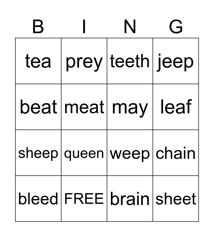 This bingo card has 28 words: need, beef, sheep, cheek, meat, teeth, prey, sheet, FREE, feed, weep, jeep, sweep, feast, queen, treat, clay, may, leaf, mail, tea, street, bleed, chain, brain, creek, beat and feet.