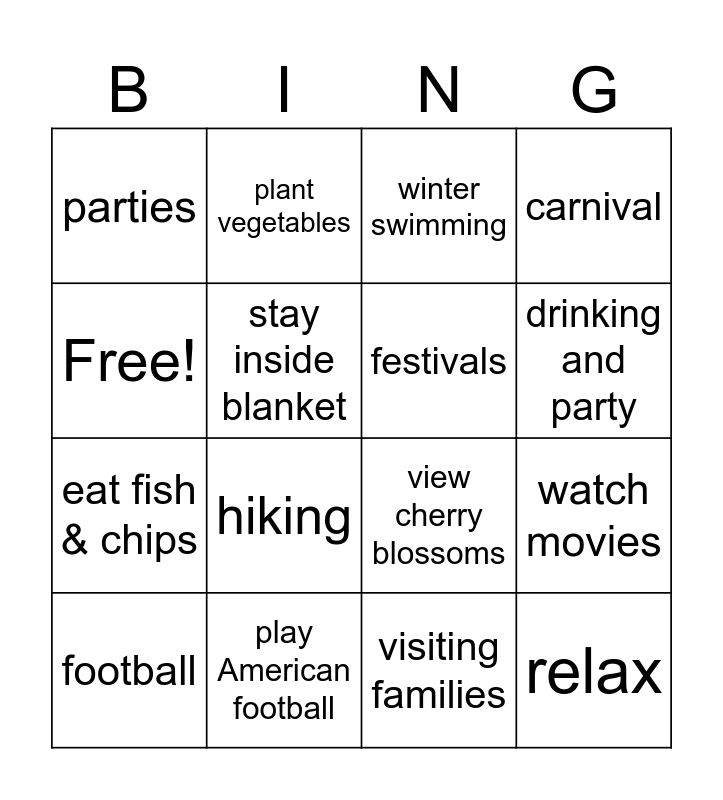 This bingo card has 16 words: play American football, watch movies, winter swimming, parties, eat fish & chips, plant vegetables, view cherry blossoms, visiting families, Free!, stay inside blanket, football, carnival, hiking, drinking and party, festivals and relax.