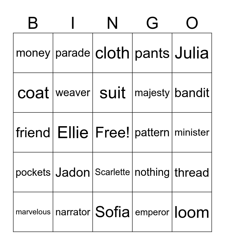 This bingo card has a free space and 29 words: marvelous, Lucas, Ellie, unfit, money, cloth, weaver, Jadon, pattern, narrator, minister, loom, Sofia, emperor, bandit, palace, Scarlette, pockets, Julia, friend, nothing, silk, majesty, coat, pants, parade, thread, suit and clever.