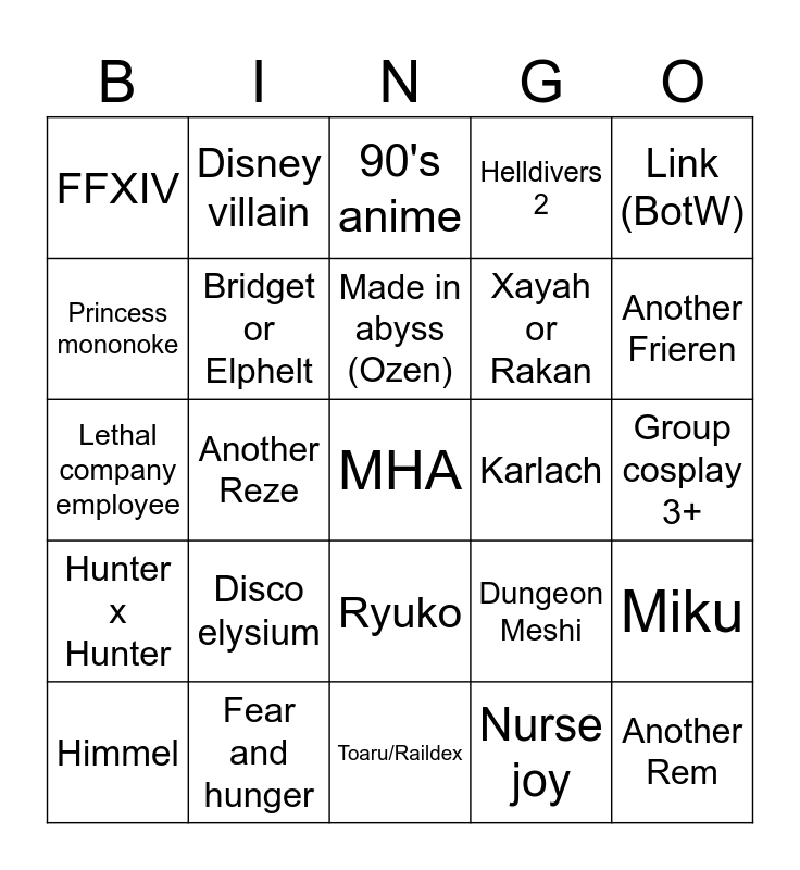 This bingo card has a free space and 24 words: Disco elysium, Fear and hunger, Made in abyss (Ozen), Himmel, Link (BotW), FFXIV, Princess mononoke, Disney villain, Karlach, Ryuko, Xayah or Rakan, Lethal company employee, Dungeon Meshi, Miku, Bridget or Elphelt, Nurse joy, Group cosplay 3+, 90's anime, Another Frieren, Another Reze, Another Rem, Hunter x Hunter, Helldivers 2 and Toaru/Raildex.