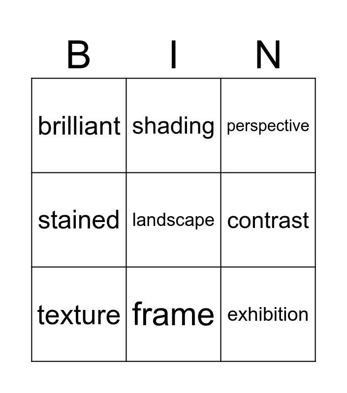 This bingo card has 11 words: exhibition, frame, landscape, texture, shading, perspective, contrast, space, stained, brilliant and pale.