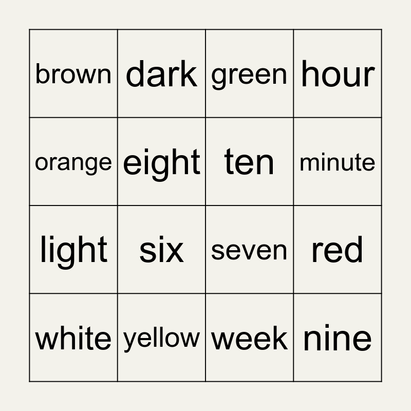 This bingo card has 20 words: red, blue, green, black, white, orange, yellow, brown, light, dark, six, seven, eight, nine, ten, second, minute, hour, week and month.