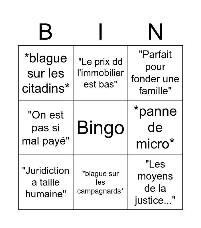 This bingo card has a free space and 9 words: "Juridiction a taille humaine", "Parfait pour fonder une famille", "Le prix dd l'immobilier est bas", "On est pas si mal payé", *blague sur les citadins*, *panne de micro*, "Les moyens de la justice...", *blague sa clientèle * and *blague sur les campagnards*.