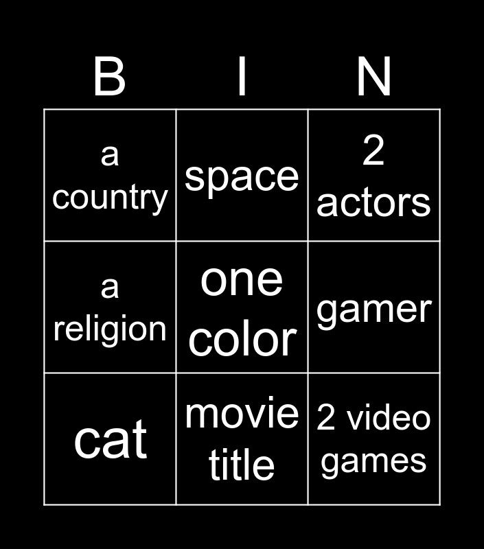 This bingo card has 9 words: cat, 2 actors, space, a religion, a country, gamer, one color, 2 video games and movie title.
