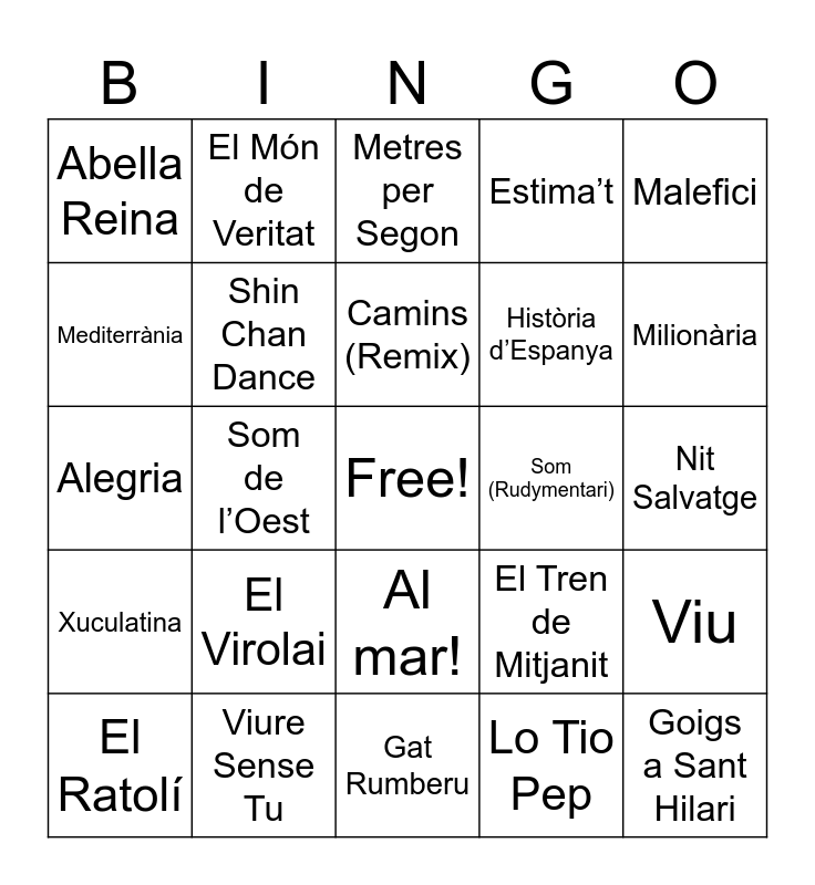 This bingo card has a free space and 90 words: La Santa Espina, La Balanguera, Al mar!, Tobogan, L’estaca, Els Segadors, Havia de Passar, El Cant de la Senyera, La Flama, Quina Calitja, Bon Dia, Camins (Sopa de Cabra), L’Empordà, Nit Salvatge, Vull estar amb tu, Camins (Remix), Mai Trobaràs, El Boig de la Ciutat, Un Camell d’Orient, Llença’t, Jean Luc, Més Que la Meva Sang, Gat Rumberu, Volcans, Alegria, Viure Sense Tu, La Faixa, Que Pasa Nen, Esbarzers, Sols el Poble Salva al Poble, Una Altra Ronda, Viu, Amor i Amistat, Xuculatina, Abella Reina, Estima’t, Metres per Segon, Camins (Obrint Pas), Som de l’Oest, Milionària, El Ratolí, Mediterrània, Escriurem, La Gent que Estimo, Boig per Tu, El Tren de Mitjanit, El Vol de l’Home Ocell, Jenifer, M’Aclame a Tu, Perquè Vull, Cac Blac, Història d’Espanya, L’Últim Tirabol, Bona Vida, The Bright Side, Comboi, Som (Rudymentari), Nòmada, Gira la Moneda, Nens del Barri, Valentina, Vu i Se Pulisia, Som (Obrint Pas), No S’apaguen les Esteles, Quan Caminàvem, L’Últim Segon, En Joan Petit, Lo Tio Pep, Llum, Foc , Destrucció, Rojos y Separatistas, El Virolai, Goigs a Sant Hilari, Verí caducat, Barras Warras, El Món de Veritat, Shin Chan Dance, Coti x Coti, Benvolgut, Coenta, Pare nostre que esteu en el cel, Il·legal, Malefici, Bicicletes, Em dones força, Mussegu, 4 KISSUS, El vermutillu, Estiu, Panya and Aurora.