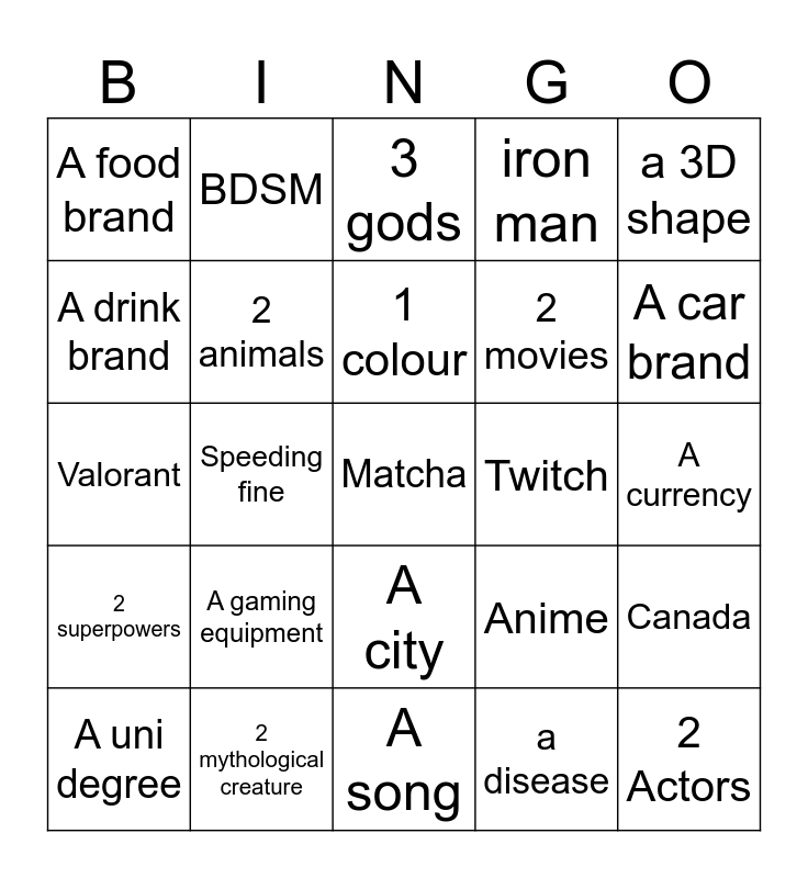 This bingo card has 25 words: A gaming equipment, A song, 1 colour, A uni degree, a 3D shape, A food brand, A drink brand, BDSM, Twitch, A city, 2 movies, Valorant, Anime, Canada, 2 animals, 2 Actors, A currency, 3 gods, A car brand, Speeding fine, Matcha, 2 mythological creature, 2 superpowers, iron man and a disease.